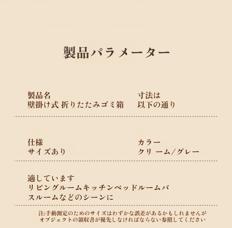壁掛け折りたたみ式で省スペース、簡単設置。キッチンやバスルームの廃棄物収納に最適。キャビネットドア対応で使いやすい。